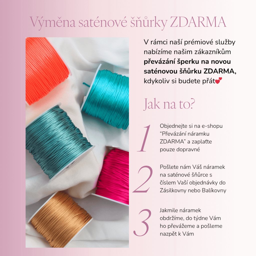 Náramek je navlečen na jemné saténové šňůrce o průměru 1 mm, vybírat můžete až z 28 barev.