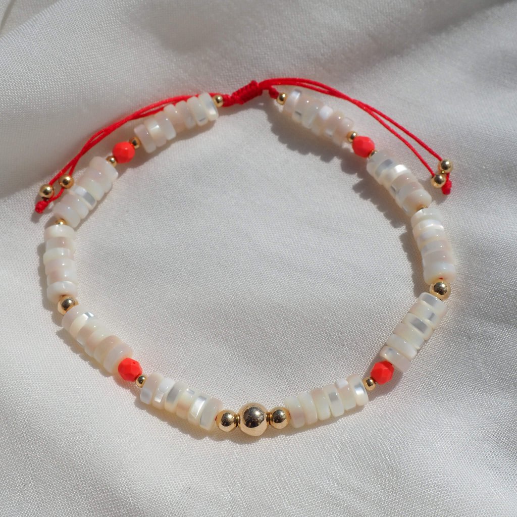 Tento letní náramek na kotník s perleťovými korálky je dokonalou kombinací elegance a jemnosti. Každý náramek je ručně vyrobený z pečlivě vybraných perleťových korálků, které jsou doplněny gold filled materiálem a jemnými korálovými korálky.