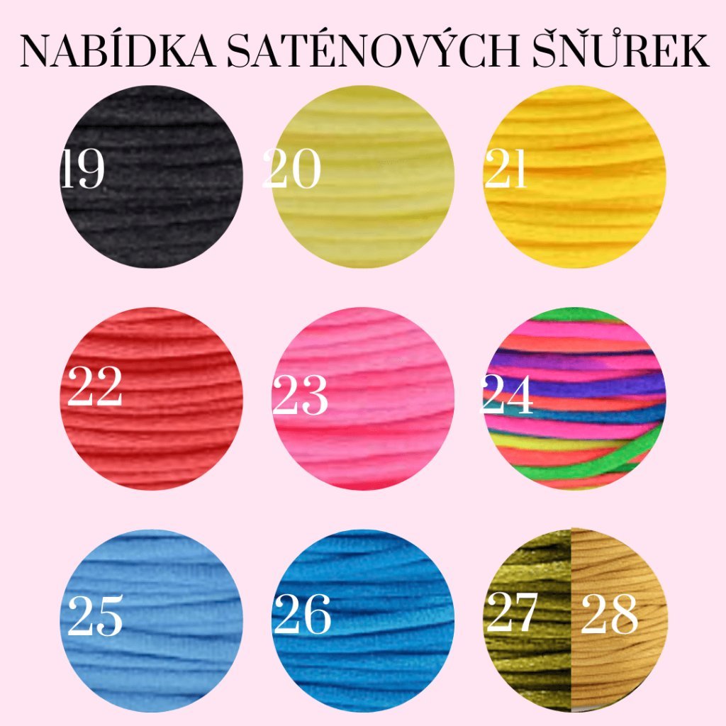 - Náramek je navlečen na jemné saténové šňůrce o průměru 1 mm, vybírat můžete až z 28 barev.