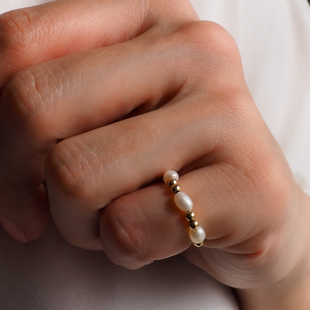 Ručně vyráběný prstýnek ze sladkovodních perel, doplněn gold filled kuličkami pro dechberoucí efekt.
